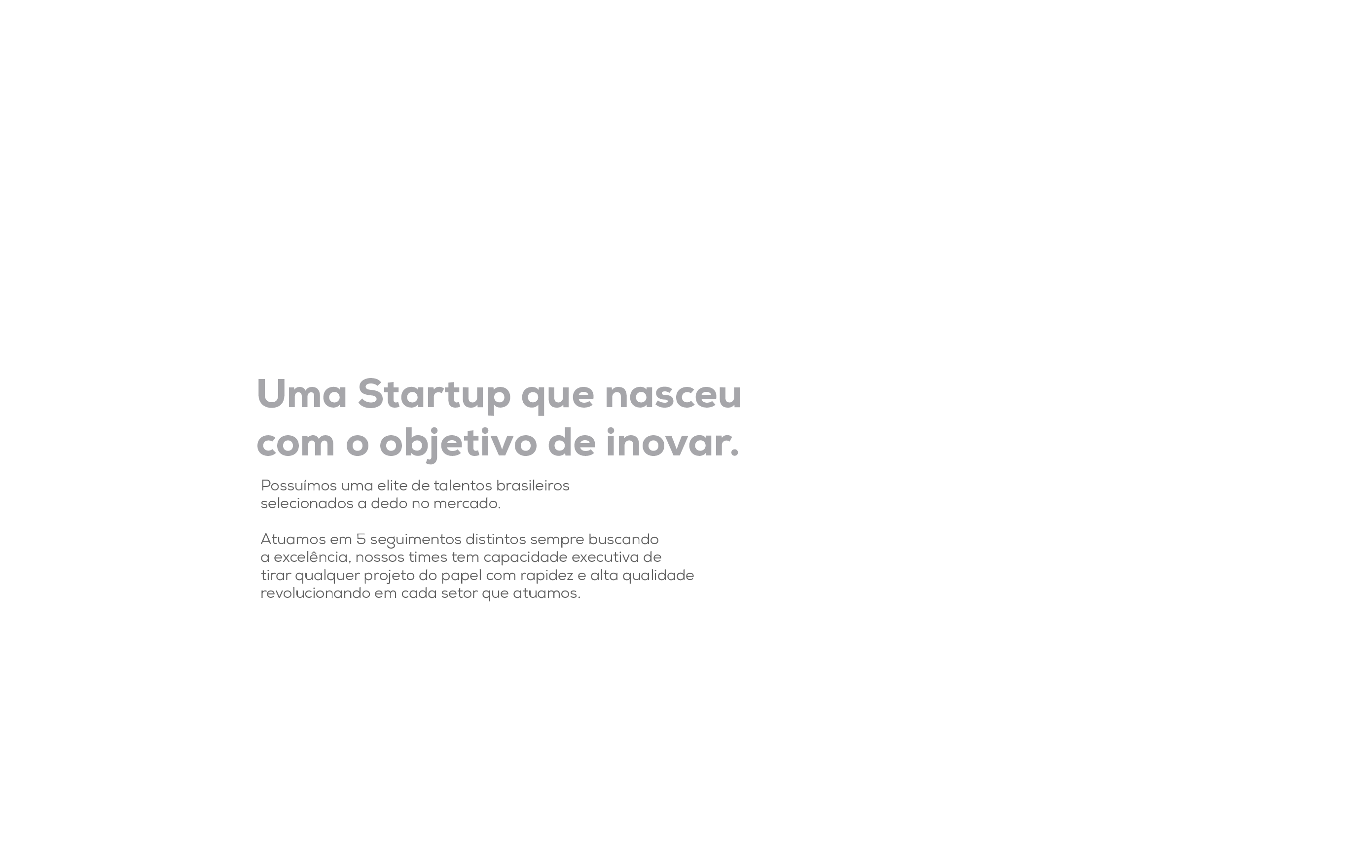 Nossa Startup teve um início inusitado, ao invés de nascer de uma ideia como as demais, nascemos da capacidade executiva de nosso time de desenvolvedores e da criatividade do nosso CEO, utilizamos do nosso time de elite selecionado a dedo pra garantir rapidez, alto desempenho e qualidade ímpar em todos nossos projetos.